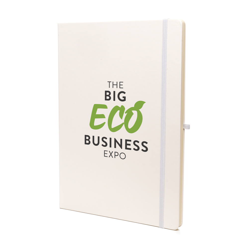 A4 white PU soft finish 80 sheet lined notebook with white bookmark, back pocket, coloured elastic pen loop and elastic closure.