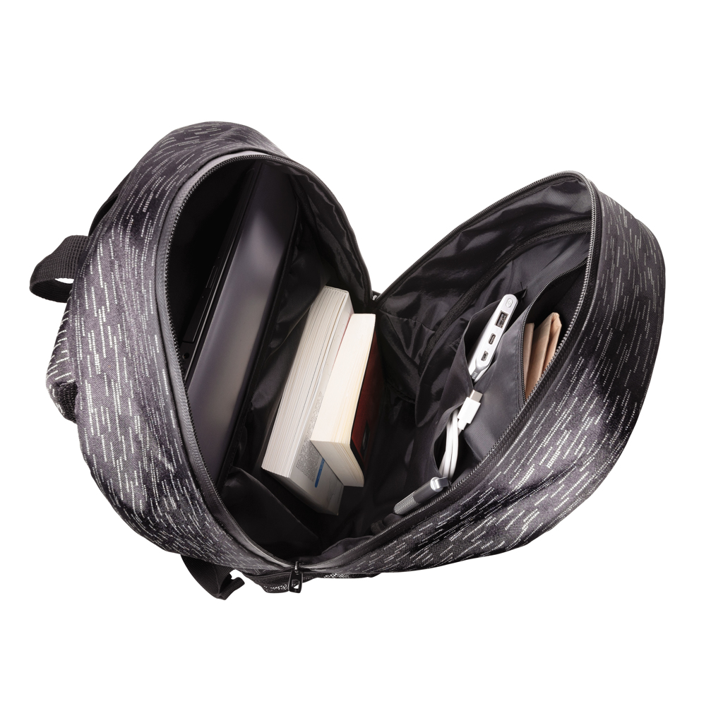 Increase your visibility in style with this backpack made with 100% recycled polyester and AWARE™ tracer. With AWARE™, the use of genuine recycled fabric materials and water reduction impact claims are guaranteed, by using the AWARE disruptive physical tracer and blockchain technology. Save water and use genuine recycled fabrics. The backpack features a modern allover reflective print, a main compartment with 15.6 inch laptop compartment, a front zipper pocket and 2 mesh pockets. Adjustable straps. PVC free. This bag saved 8 liters of water and is made of 16 plastic bottles.