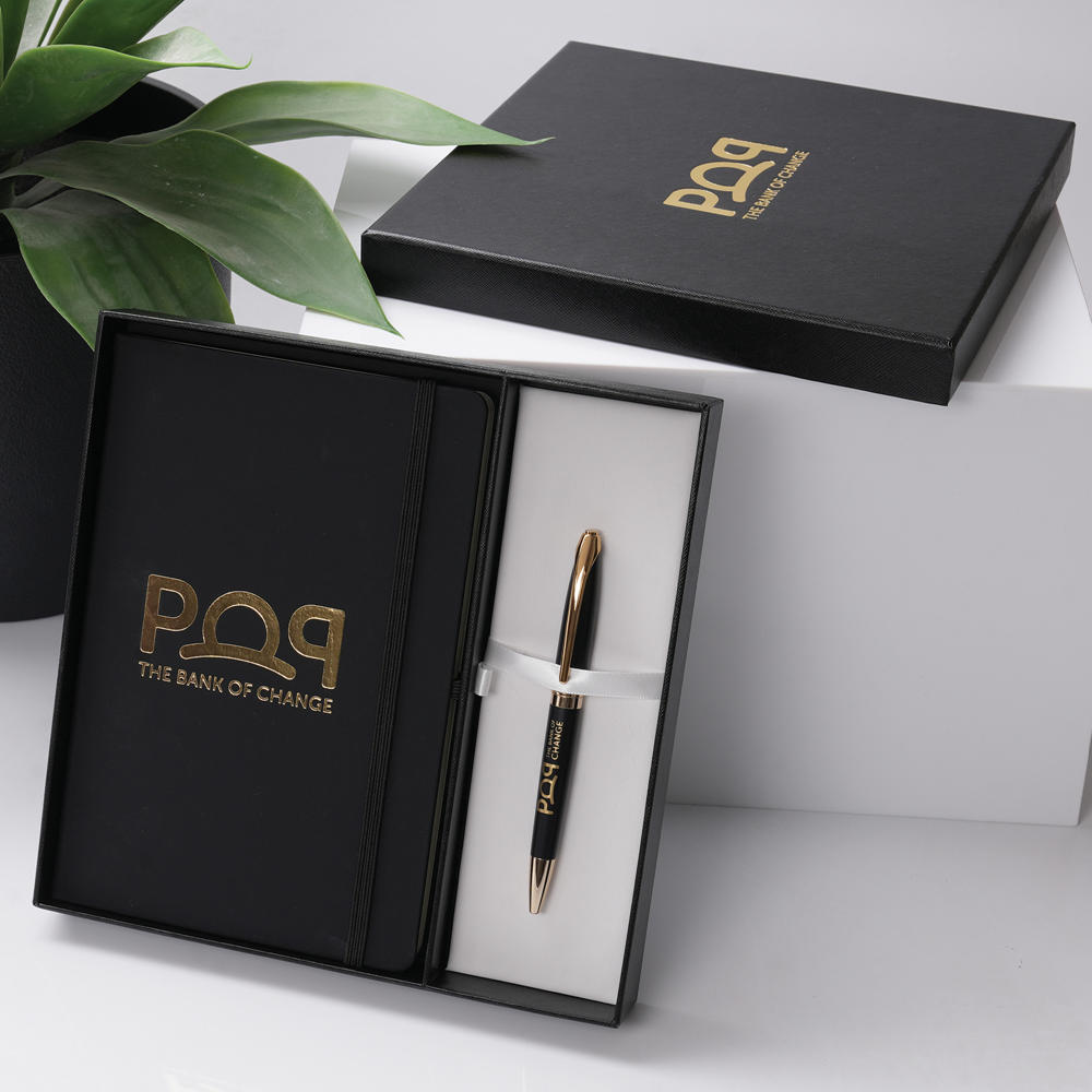 2-in-1 A5 Mole Notebook and pen in a purpose made gi¬ft box. The notebook has 80 lined sheets, back pocket, pen loop, elastic closure and bookmark. Choose any pen from our extensive range to complete the set. Product priced is the Ballad Gold Ball Pen. Price shown is for foil block to the box, foil block to the notebook and engraving to the pen.