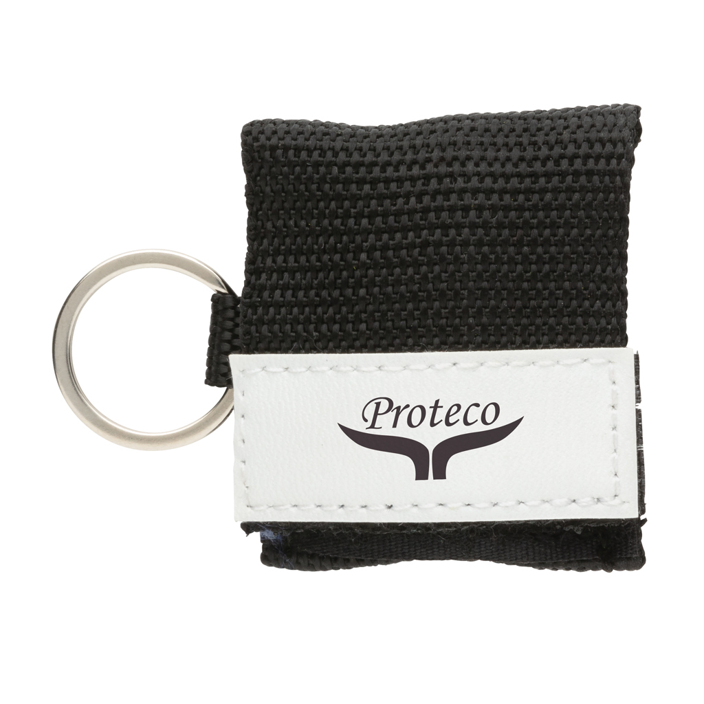 Keychain CPR mask.  Small CPR face shield for mouth to mouth resuscitation in webbing style pouch with velcro closure and steel keyring. Conform EN 13485:2003.