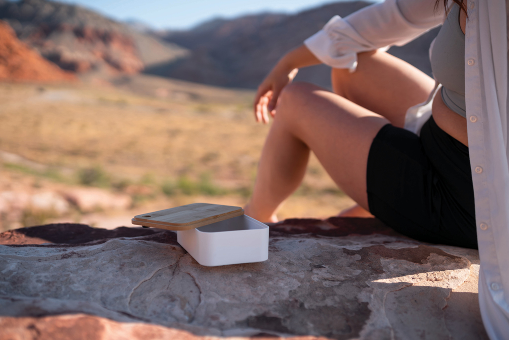Packing lunches is easier than ever with this PP lunch box and bamboo lid. Capacity 1.4 litre. Includes a handy elastic strap and spork. Including FSC®-certified kraft packaging. Handwash recommended.