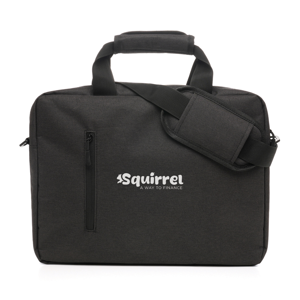 3000D RPET laptop satchel bag featuring a polyester lining, foam padding, webbed short handles, and a removable adjustable strap. The bag includes a front zipped pocket for holding valuables and comes with a pre-printed RPET label.