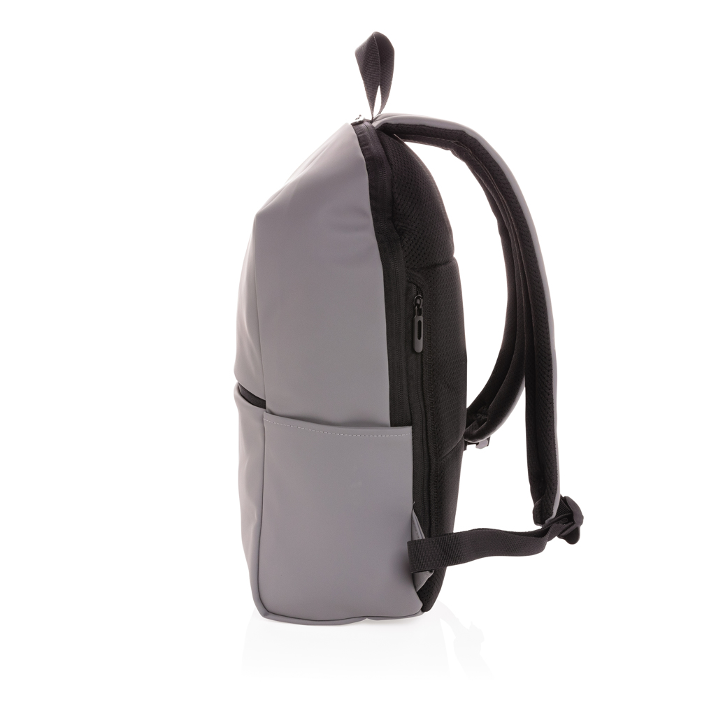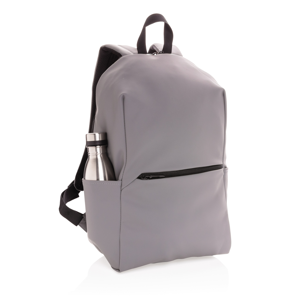 This minimalist, modern backpack made of smooth PU is fully lined and features an inner 15.6 inch laptop compartment, a spacious main compartment and 2 inner pockets and 2 pen loops. Mesh padded back and adjustable straps. Exterior 100% PU. Interior 100% 210D polyester. PVC free.