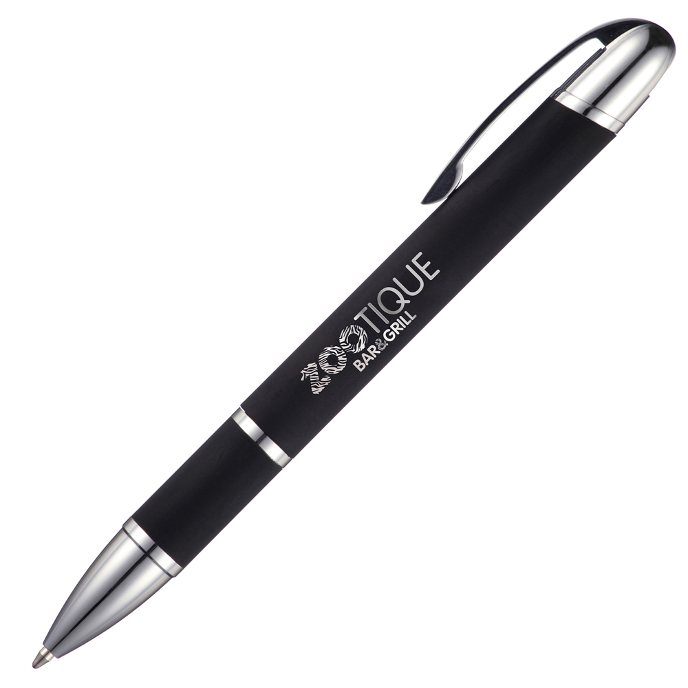 An elegant and modern ball pen in soft feel black finish. Hinged clip and undercoated chrome for a mirror chrome finish when engraved.