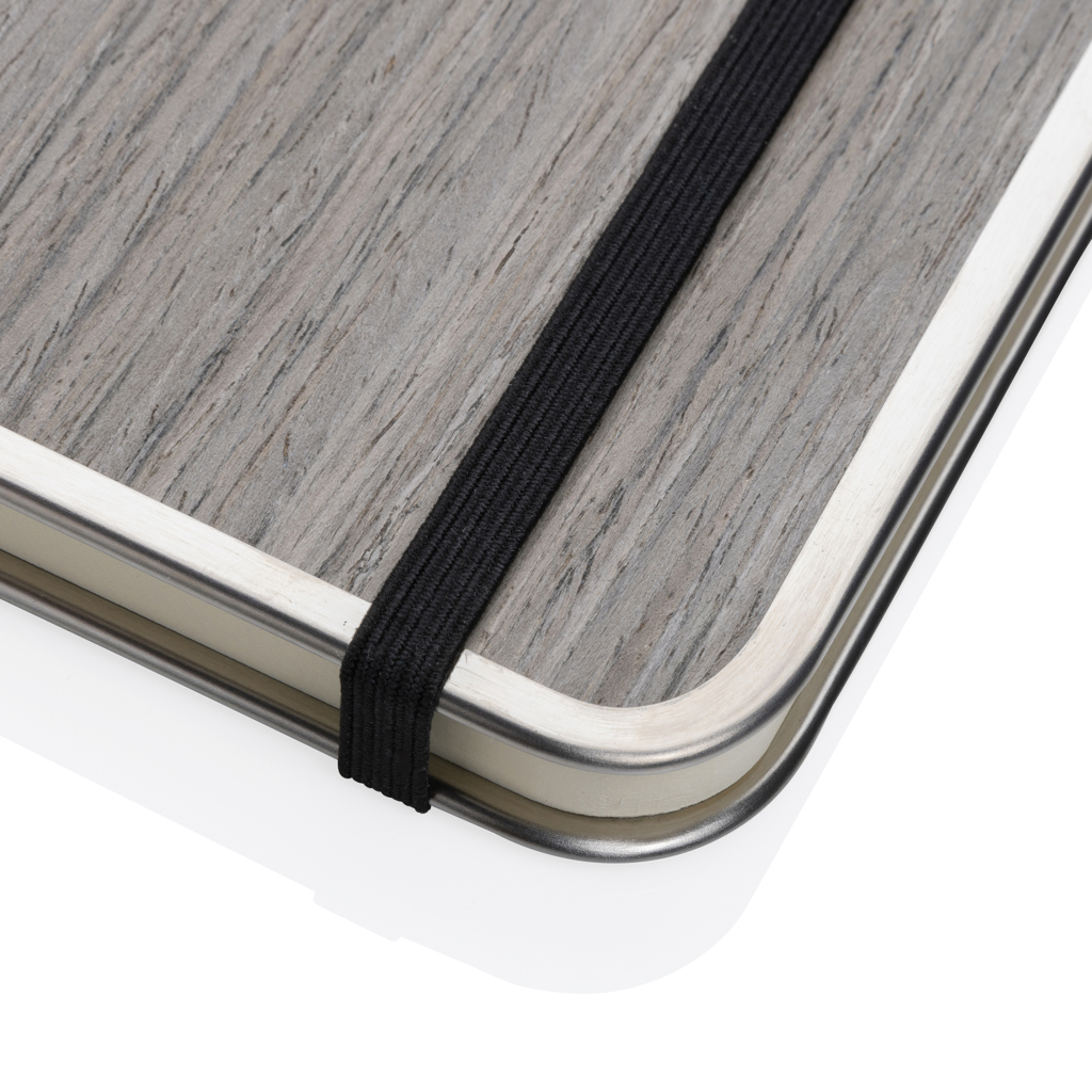 The Treeline A5 notebook is a sophisticated choice for jotting down all your notes. The notebook features a metal binding, and elastic band and has a luxury FSC® wooden cover. Inside you will find 80 sheets (160 pages) with 80gsm lined white paper. Packaged in FSC® mix kraft sleeve. This notebook is a stylish choice for all your writing needs.